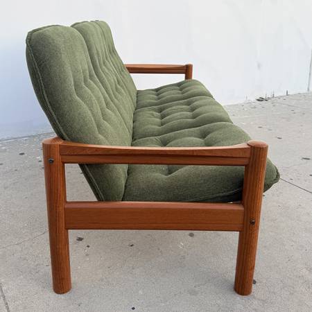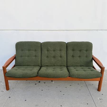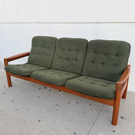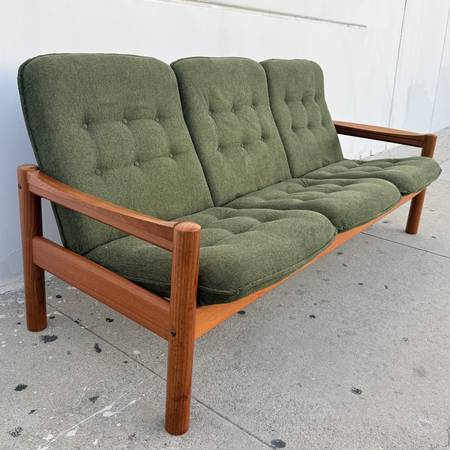 For sale is a stunning, restored Mid-Century Danish Teak 3 Seater Sofa by Domino Møbler, Made in Denmark Circa 1970s. This delightful Scandinavian sofa features a solid teak exoskeletal frame supporting 3 plush floated seats. The seats have been rebuilt from the inside out with new foam and springs making for a very comfortable sit. The button tufted cushions have been newly upholstered in a sharp hunter green linen that perfectly compliments the teak wood frame. This sofa is enjoyable to look at from every angle and ready for decades more service with classic Danish Modern style.