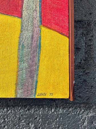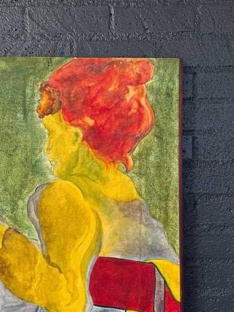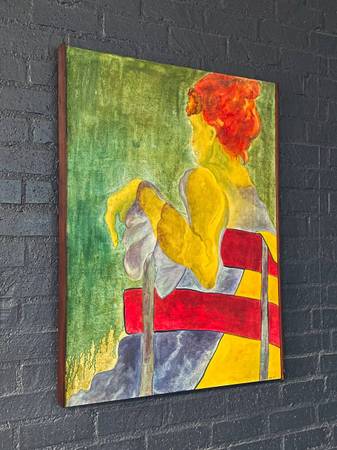This striking Expressionist painting, Seated Woman in Red Chair by Jūratė, c.1975, captures a contemplative female figure rendered in bold, vibrant colors. The artist’s use of exaggerated hues and simplified forms reflects the emotional depth and stylistic freedom of 1970s European Modernism. Executed in oil on canvas and housed in a wood frame, the composition balances abstraction with figuration, creating both intensity and intimacy. The palette of fiery reds, golden yellows, and deep greens gives the work a dynamic energy while evoking quiet reflection.