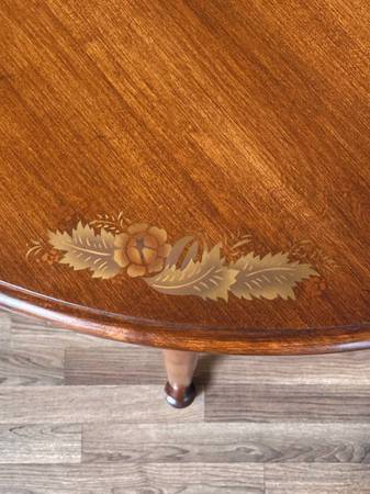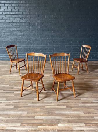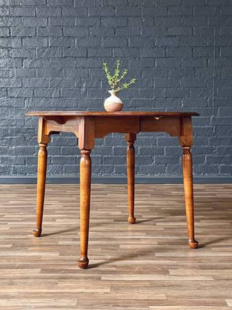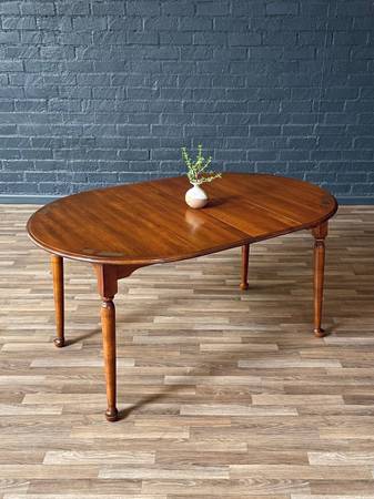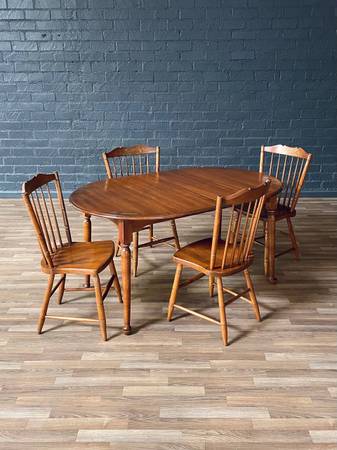 This dining set by L. Hitchcock exemplifies the American Colonial Revival style, crafted in Connecticut during the mid-20th century. The solid maple table features an extendable top with hand-stenciled floral motifs at the corners, complemented by four spindle-back side chairs with matching decorative stencil work. Each chair bears the traditional Hitchcock stencil mark, a sign of authenticity from one of America’s most celebrated furniture makers. With its warm maple finish and sturdy craftsmanship, the set reflects the enduring quality and charm of New England furniture traditions. Perfect for dining spaces that blend classic heritage with everyday functionality, it offers both historical character and lasting durability.