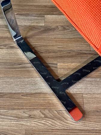 This signed Mies van der Rohe “Brno” chair, produced by Knoll in the 2000s, embodies the timeless elegance of Bauhaus design. Its sleek cantilevered steel frame creates a striking silhouette, complemented by the vivid original orange fabric upholstery. Designed to balance simplicity with comfort, the chair’s flowing lines and minimalist structure highlight van der Rohe’s famous principle of “less is more.” Both sculptural and functional, it remains one of the most iconic designs in modern furniture history. Presented here in original vintage condition, it is a collector’s piece that captures the essence of mid-century modern sophistication.