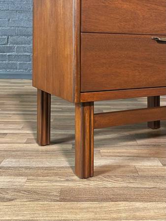 This single walnut nightstand by Bassett Furniture, crafted in the 1960s, is a beautiful example of classic Mid-Century Modern design. Featuring clean lines, beautiful walnut construction, and original brushed metal drawer pulls, the piece offers both form and function. Its two spacious drawers glide smoothly, making it perfect for storing bedside essentials while maintaining a sleek profile. The base features sculpted legs with vertical grooves and a stretcher detail that adds architectural interest. Expertly refinished, this nightstand is ready to bring timeless elegance and utility to any modern or vintage-inspired space.
