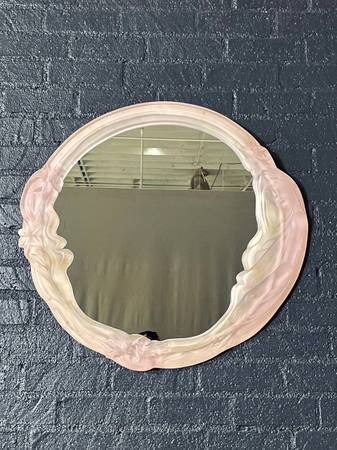 This vintage Art Nouveau style mirror from the 1980s is crafted from frosted pink Lucite with its original mirrored glass. The circular frame features an elegant figural design of flowing women and floral motifs, embodying the organic curves and romantic sensibility that defined the Art Nouveau movement. The Lucite material adds a soft translucence, creating a dreamy pastel glow that highlights the sculptural details. In original vintage condition, it remains both a decorative statement piece and a functional mirror.