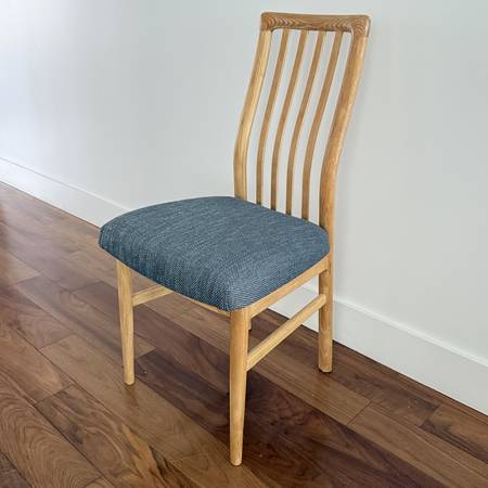 Vintage Danish Modern Dining Chair. The light ash wood frames have an ergonomic bend that cradles the spine. The seat has been reupholstered in a textured slate fabric with new foam cushion. It is comfortable, stylish and sits as good as new. It would also make an excellent desk chair, accent chair, or occasional chair, if not added to a larger mixed set.