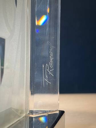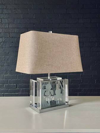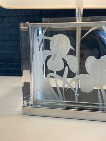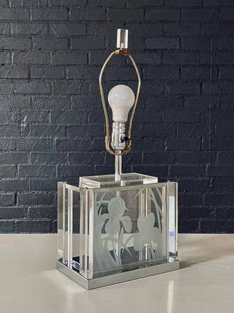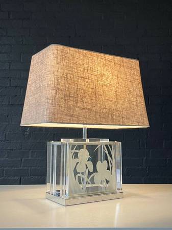 This stunning Hollywood Regency table lamp by Fredrick Ramond, crafted in the 1980s, features a striking etched glass and lucite body framed in polished chrome. The frosted floral motif brings a delicate elegance that contrasts beautifully with the crisp geometry of the lucite frame. Topped with a brand-new linen shade, the lamp provides a soft, ambient glow perfect for sophisticated interiors. The original wiring is fully intact and functional, preserving the integrity of the piece. Signed by the designer, this lamp is a rare collector’s item that embodies the glamor and bold design of the era.
