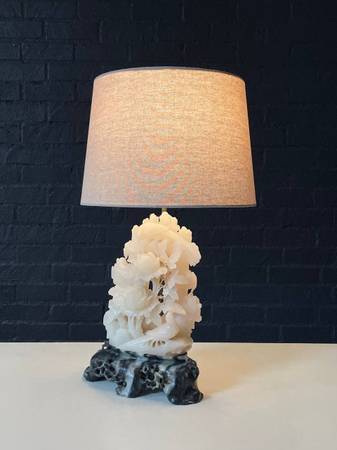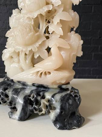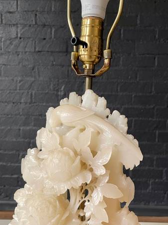 This vintage Italian Neoclassical alabaster table lamp showcases masterful craftsmanship with its intricately carved floral and bird motif. The luminous alabaster sculpture sits atop a striking black and white marbleized base, adding depth and contrast to the design. Retaining its original wiring, the lamp has been updated with a new shade for a refreshed look. Its delicate details and natural translucency create a warm, ambient glow when illuminated. A timeless statement piece, perfect for adding an air of elegance to any space.
