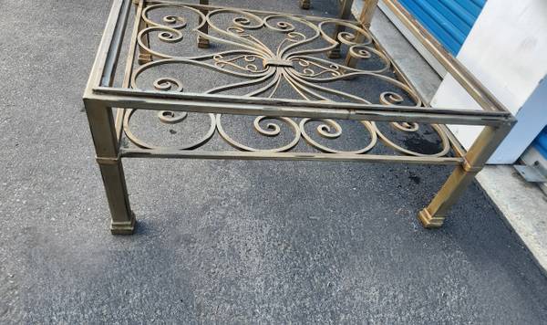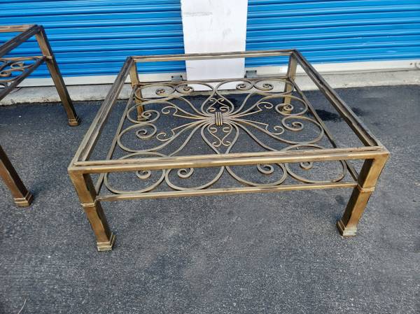 The simple lines of this coffee table made in Italy contrast with the stylized scroll of gentle swirls and flower buds. The metal frame has an aged silvery-bronze finish with a gently worn patina and is topped with a transparent beveled glass top.