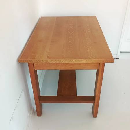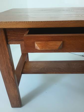 Hi, I am selling a desk. This beautiful desk is from the 30s - 50s, oak wood, one drawer, smooth surface and a blond color finish. It is in great functional condition, heavy, strong, compact and complete, nothing loose or missing. 43" wide, 29" deep, 30" tall.