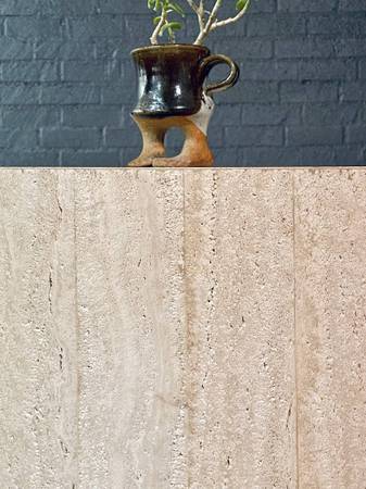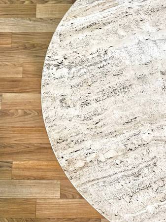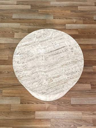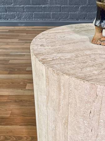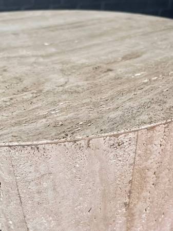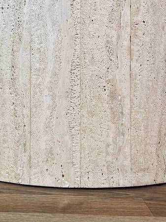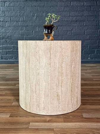 This vintage Italian pedestal table is a striking example of Post Modern minimalism, crafted entirely from natural travertine stone. The bold cylindrical form and continuous vertical grain create a sculptural presence, while the neutral stone offers subtle texture and tonal variation. Its clean silhouette and solid construction make it ideal as a side table, display pedestal, or even a statement coffee table in a curated interior. The surface features natural pores and veins characteristic of travertine, adding depth and authenticity to the piece. Preserved in its original vintage condition, it retains its timeless elegance with minor signs of age consistent with its 1970s origin.