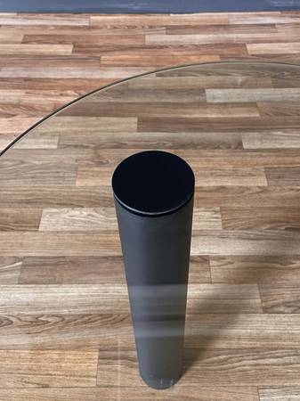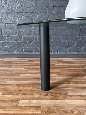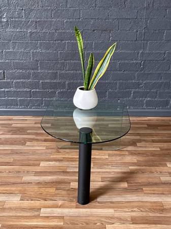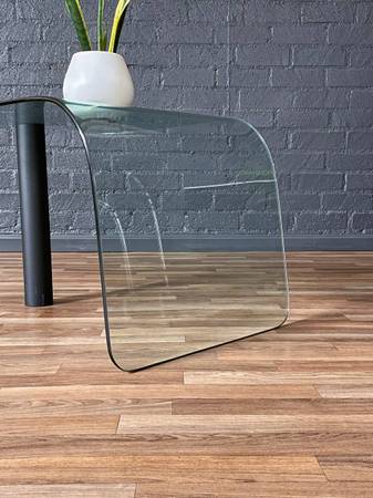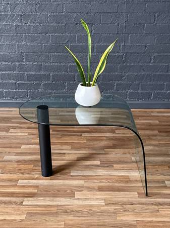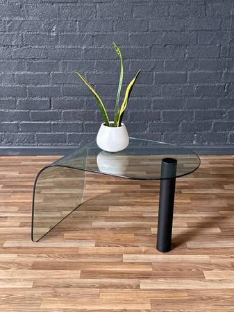 This sculptural Post Modern glass table from the 1980s features a striking waterfall design crafted from a single curved pane of glass. Anchored by a bold cylindrical metal leg, the table balances elegance with architectural edge. Its transparent form creates a sense of lightness, while the asymmetrical shape adds a dose of visual intrigue. Perfect as a coffee table or side table, this piece brings both function and futuristic flair to any room. A true conversation starter, it reflects the playful experimentation of late 20th-century design.