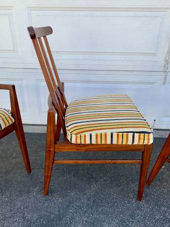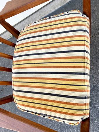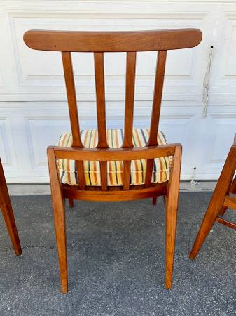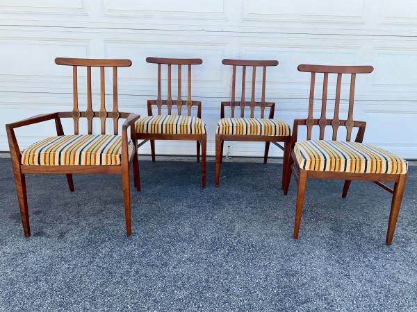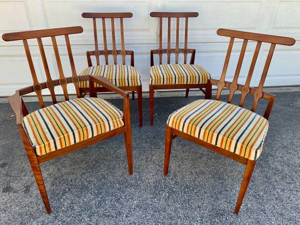 These is a set of vintage Harvey Probber- Foster McDavid Chairs. Perfect for that modern mid century style. The amazing design of the architectural spindle back makes these chairs works of art. The foam of the chairs are brand new but we really like the original fabric and decided to keep them. They have so much character. Deep cleaning or reupholster of seat is recommended. One of the chairs back broke but was professionally restored. Almost unnoticeable! See photos for reference. These are amazing chairs! One arm chair 3 armless.