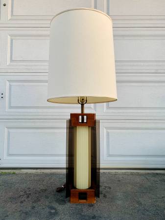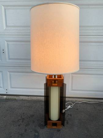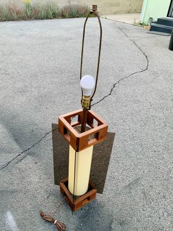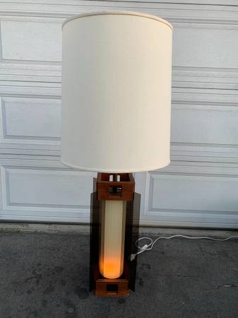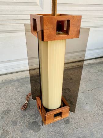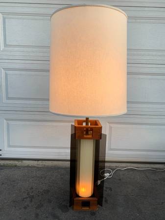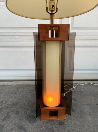 This is a very tall vintage mid century lamp made of wood with acrylic accent fins. Comes wit light 3 settings. I’m almost perfect condition. The base lights up as well. Some wear appropriate with age. Very tall. Perfect for that mid century modern style.