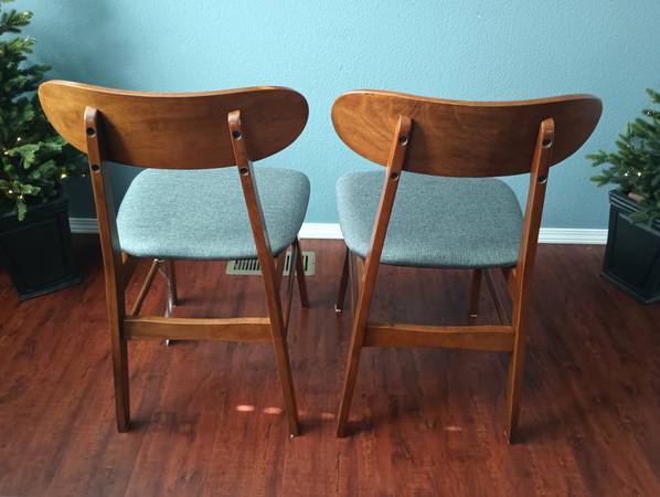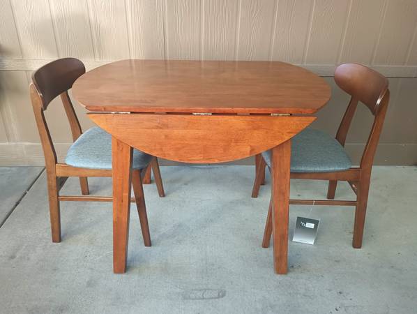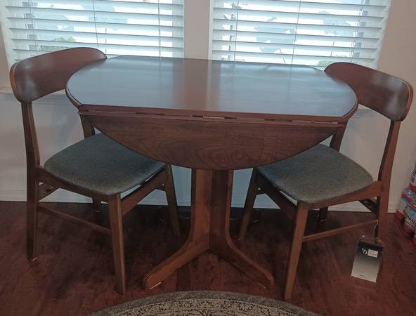 Table with fold out leaf on both sides great for small spaces. With two brand new modern chairs with padded seat and back rest. Very comfortable table height 30 inches width 42 inches depth 28 inches without leafs extension. 42 inches by 42 inches with both leafs out. Dinette table and chairs, dinette set, bistro table and chairs, table round, modern chairs in excellent condition
