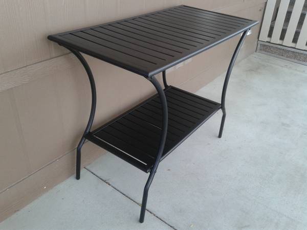Sturdy metal two tier planting table. Great for many uses, potting plants, work table, storage table weather resistant metal slat style table top. Height 30 inches width 40 inches depth 20 inches in...
