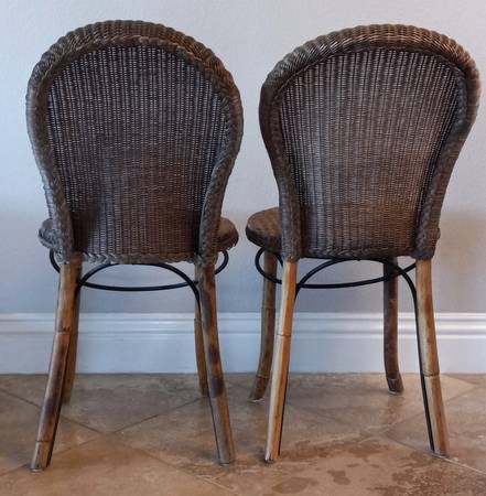 A set of 2 Palecek Bamboo Wicker Natural Bistro Chairs Beautiful handmade chairs Excellent condition. Measure 34.5" Tall 16.5" wide 16.5" Deep