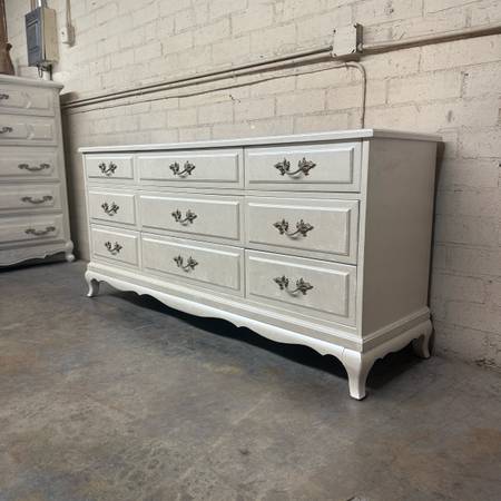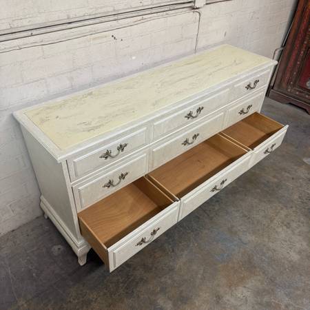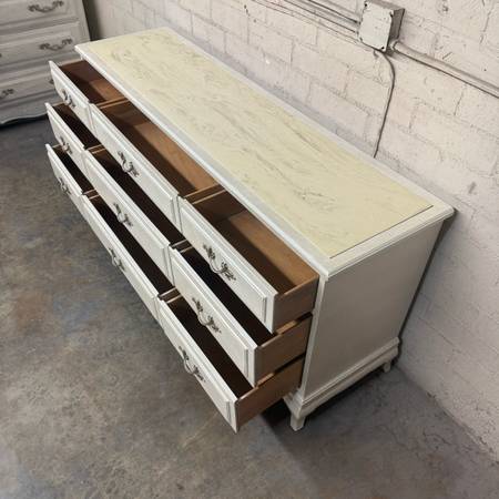 Delivery is available Vintage solid wood Cavalier Furniture Dresser – Custom Pearl White Finish – Faux Marble Top$670 OBO! Dimensions:W=67in. D=18in. H=31,5in. / Delivery is available. / Click...