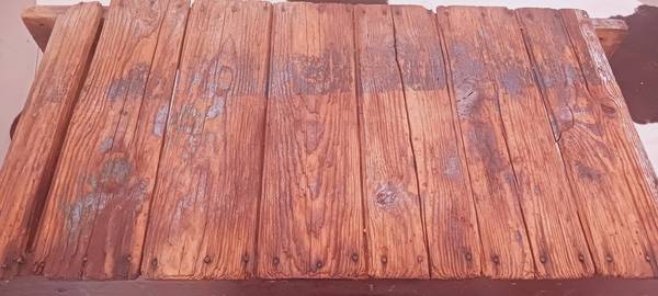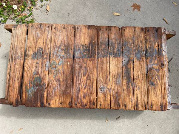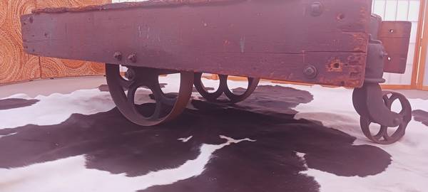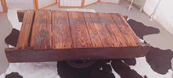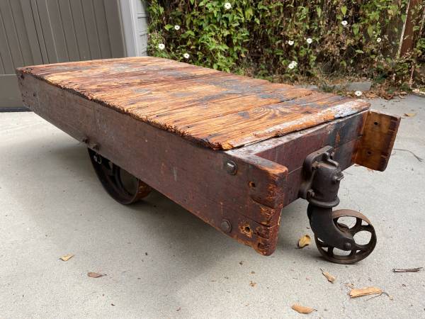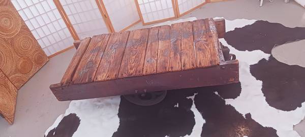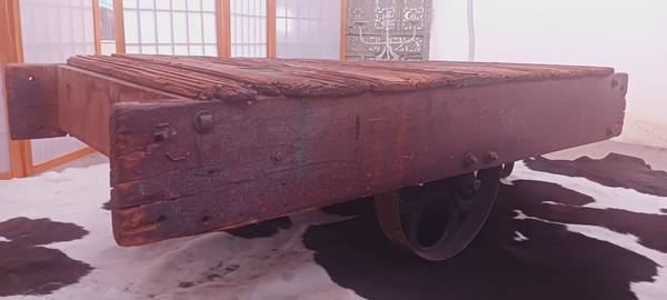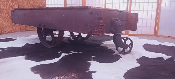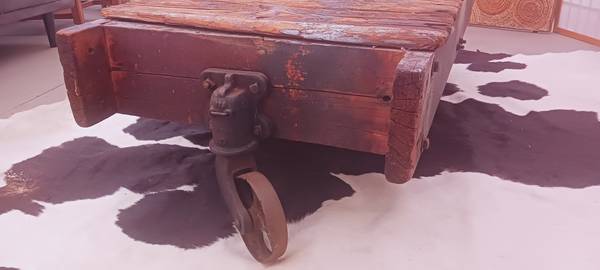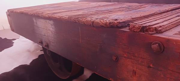 It's aged rustic wood with heavy iron ,it rolls well, was a working work cart. It's greqt indoors. Reclaimed from a woodman craft shop.