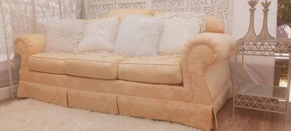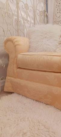 Drexel Heritage, Damask Upholstered sofa Contemporary, camek shaped back, stepped arms, loose cushion, with four high grade stuffing, or down filled pillows, tufted and pleated sides, paneled tuxedo skirt, labeled. Drexel heritage. Originally 3500. Kept covered in plastic since purchased. 87 x 41 x 34 in. In pristine condition. No soiling or signs of use. Excellently clean. Heavy well made furniture. Delivery 85 within 39 miles of van nuys. I also have some other Drexel heritage furniture pieces Please see my other listings to buy some quality piece. L shape mid century alma Co. Desk Metal and wood Restoration hardware sectional sofa with slipcover Mid century walnut credenza Stanley armoire closet Bernhardt buffet server vast Mirrored dresser Glad brass table mid century bedroom dresser set