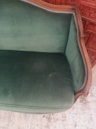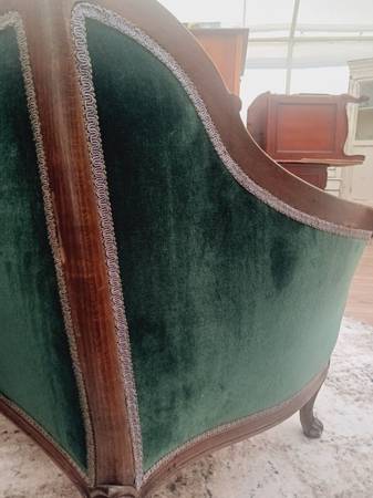 Firest green French carved antique sofa, its design is Louis XV, also known as Rococo. Characterized by its elegance, lightness, and curvilinear form.