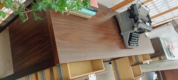 high end and well manufactured, and finished on the back as shown. It looks just as good coming as it does going. They are like 8 out of 10 vintage condition.. The top is laminate. Made to withstand use in an office setting.