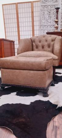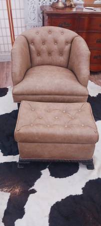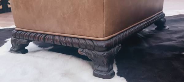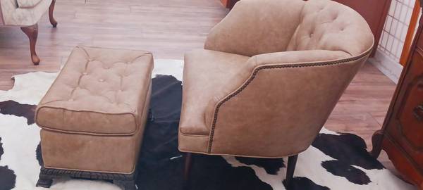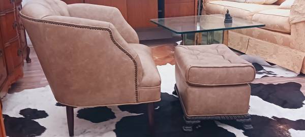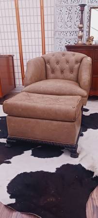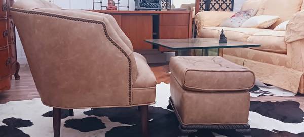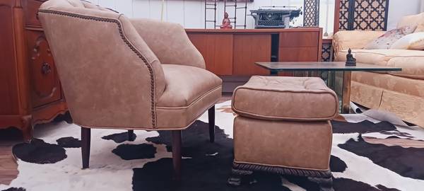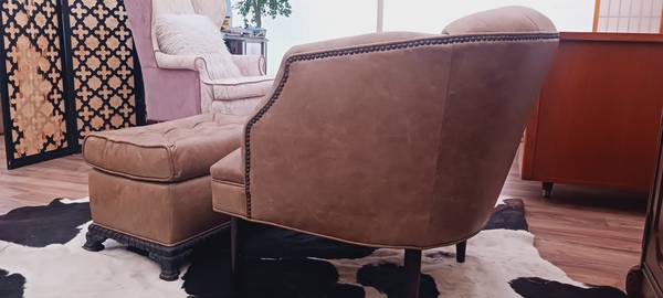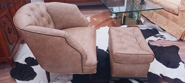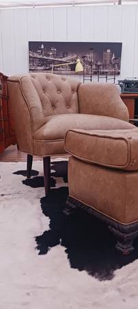 Elevates your space with this unique and exceptional metal studded and button tufted lounge chair, with cognac brown with a faux Leather material and a leatherette style finish... the ottoman is equally cool with a hardwood base and hand-carved legs throughout.