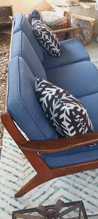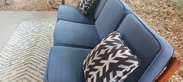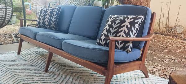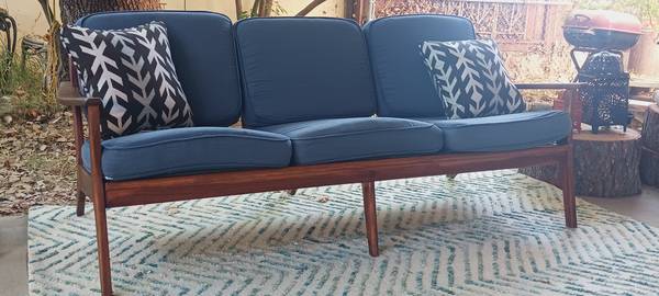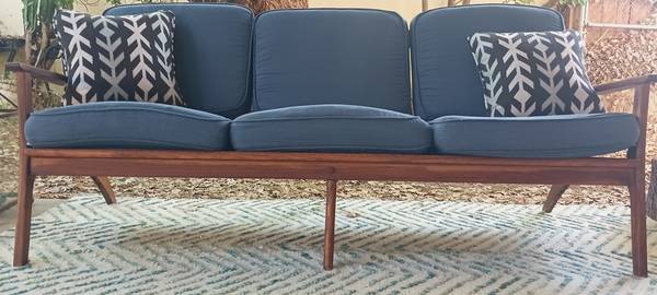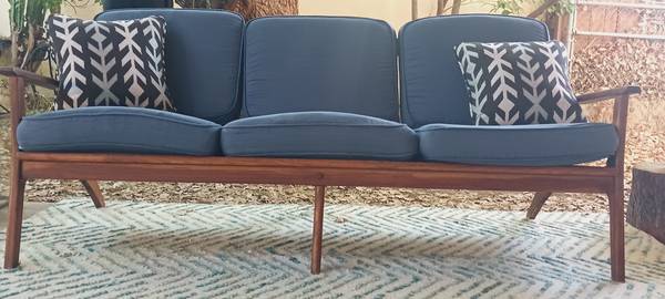 1960s Mid Century Danish Modern Settee, Sofa Couch Blue removable cushions Teak Bench Mark brand. 3 Seater