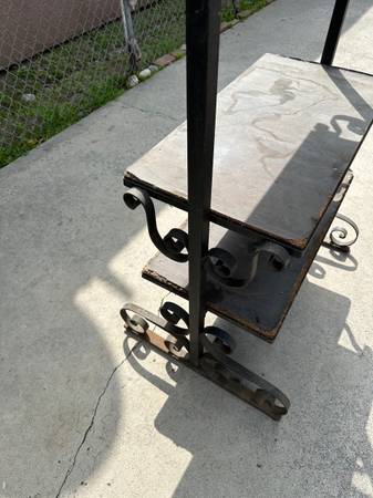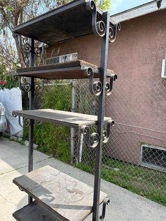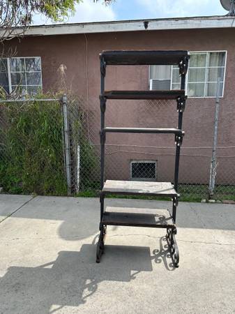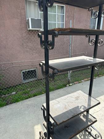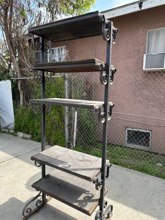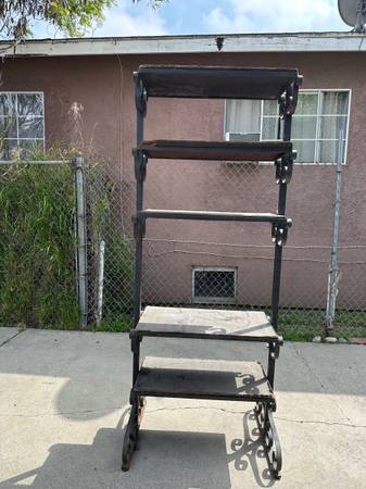 Heavy duty iron shelf unit was used on patio for plants dimensions 81 inches height 32 width 17-25 depth. Serious buyers only.