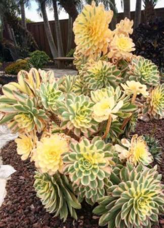 The sunburst aeonium is visually appealing and is an easy-to-care-for succulent plant with variegated leaves resembling pinwheels. Its vibrant color adds warmth and elegance to rock gardens or indoor spaces, making it a popular choice among plant enthusiasts.