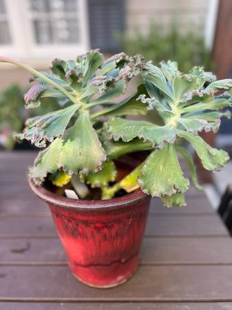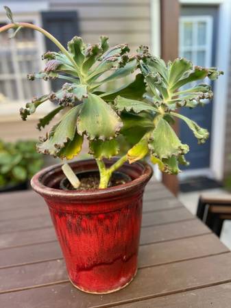 Unusual large double Echeveria named “Speed Bumps “in a beautiful glazed, high fired, ceramic pot. Leaves are remarkable for their distinctive bumps in contrasting pinkish color. It is an easy to grow rosette succulent with small, long lasting, bell shaped flowers.