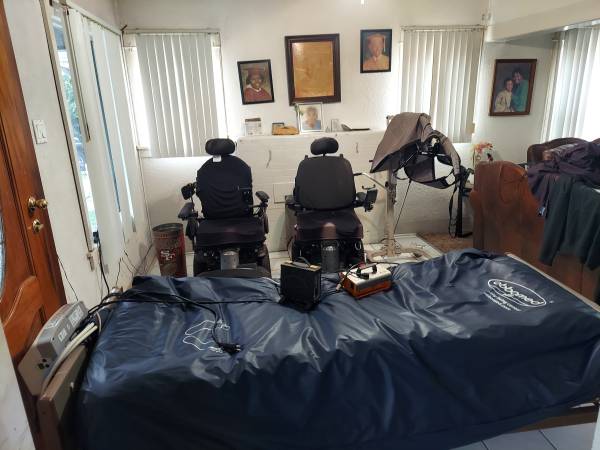 Electronic hospital bed with Obbmed, model OB-2600 turning bed; Quickie Q700M power wheelchair with SEDEO Pro seating; Quickie QM-710 power wheelchair with SEDEO seating; 400 lb Hydralic patient...
