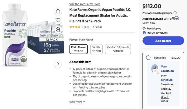 Kate Farms Organic Vegan Peptide 1.5, Meal Replacement Shake for Adults, Plain 11 fl oz 12-Pack