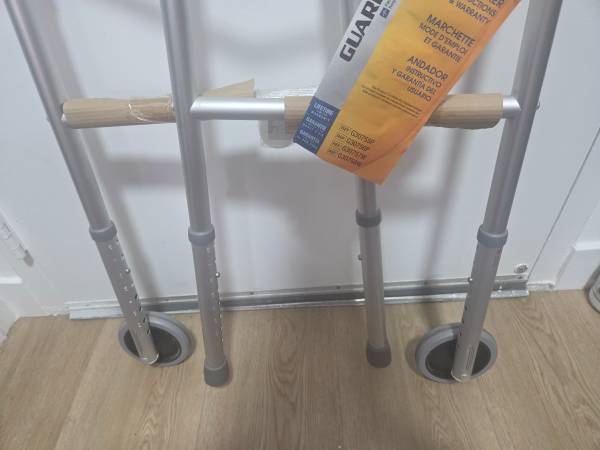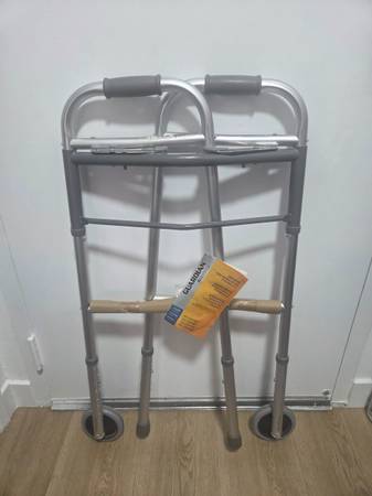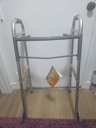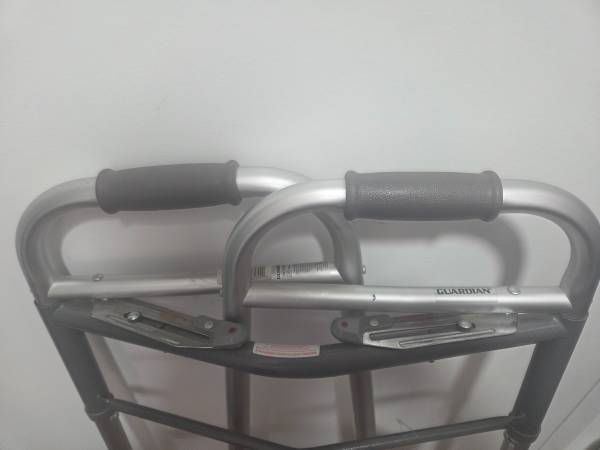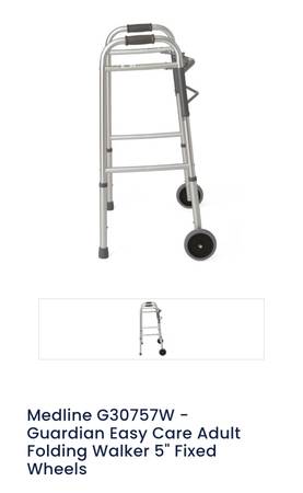 This standard Easy Care Walker with 5" Wheels has a lightweight aluminum frame with a steel cross brace that helps provide durability. Walker maintains tight tolerance between frame and foot pieces for rattle free use. Comfortable hand grips and non-marking tips. Weight capacity is 300 lbs. (136 kg). Approximate user height is 5'5"-6'4" (165-193 cm). 16.5" (42 cm) width inside hand grip. Adjusts from 32.5" to 39.5" (82-100 cm).Easy Care Two-Button Folding Walkers with 5" Wheels - G30757WQ2 X R2 X1Made in: United States