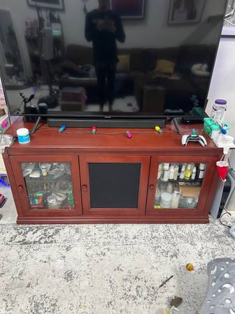 TV Stand Solid Wood 65inch long Its very heavy, has wheels to move, need two people to lift onto truck. Great condition, where the glass is, one side needs these little plastic screws to hold the...