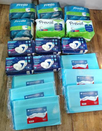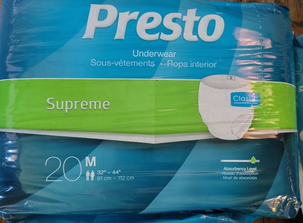 YOU GET EVERYTHING IN PHOTO New Factory Sealed Presto Classic - 20 Per Pack - 3 PACKS - Medium 32"-44" Presto Supreme - 12 Per Pack - 1 PACKS - XXL 68" x 80" Prevail Nu-Fit Daily Briefs - 16 Per...