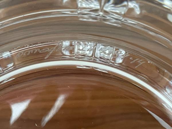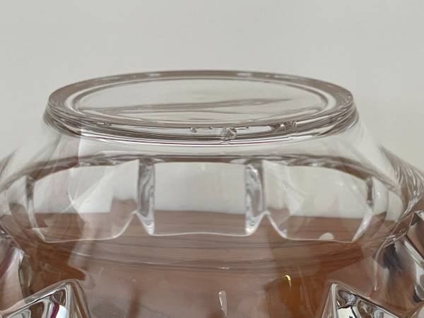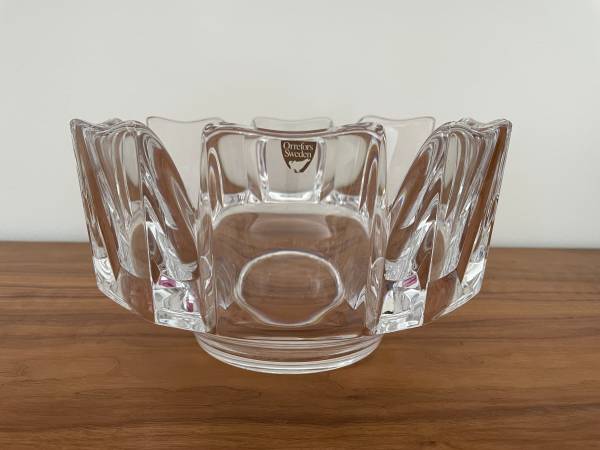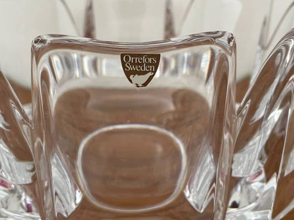 With the original Orrefors Sweden label still attached, but not the original box, this is a new, unused but imperfect item. There are no scratches or marks throughout, but there are a few very minor chips along the base that are visible with very close inspection.