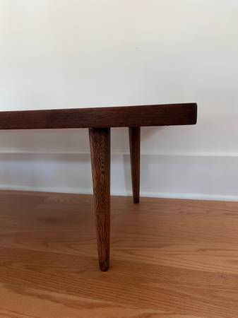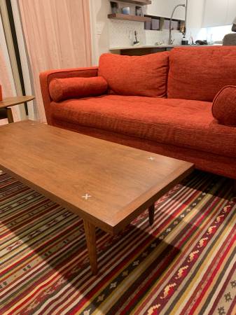 Absolutely stunning coffee table that I've loved having in my house for 5 years. It is in its original walnut finish in overall great shape. some small surface scratches but nothing visible in plain sight. The last owners glued the legs on (Maybe for extra safety? I'm unsure), so if you flip it upside down you can still see this glue. Mid century modern, crafted in the 1950's and part of Gershun's "Accord" collection.