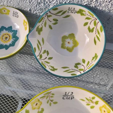 The Dutch Wax Ceramic Nesting Measuring Cups Bowls 4 Piece Set is a beautifully hand painted set with a floral pattern, perfect for adding a touch of charm to your kitchen. Made of durable ceramic, these nesting measuring cups feature various capacities and come in vibrant colors like green, turquoise, and white. With practical features like measurement markings, pour spouts, and being microwave safe, these versatile cups are ideal for all occasions and are a stylish addition to any kitchen decor.