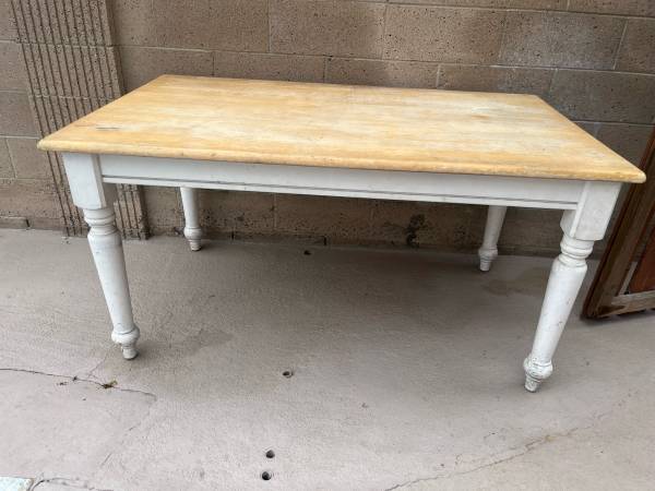 I have two solid wood tables . Both sit 6 people easy . Both are blank canvases you can paint or stain them to match your home decor.. super solid indestructible like back in the good ol'days... they simply need new homes