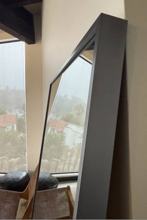 Rectangular mirror with modern, streamlined frame. Silver, matte frame, ready to hang with hardware done by framing store. 64" x 28"