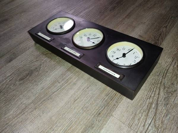 I have a: Pottery Barn Around The World 3 Time Zones Brushed Nickel Clock For Sale If interested, please text me at: If interested, please text me at: (Three 2 Three) 8 zero 2 - 4 nine 2 nine.