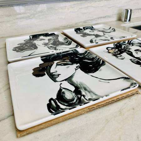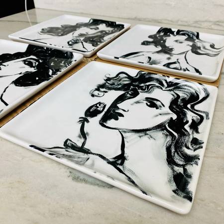 🔱 DETAILS: Rebecca Molayem Home Collection “Expression” dessert plates, set of 4. Each 8-inch ceramic plate features a unique abstract faces design in a sleek white finish. Crafted in China, these plates reflect the modern artistic style of Persian-American artist Rebecca Molayem. Perfect for elevating everyday dining, entertaining guests, or adding a touch of artistic flair to your tableware collection.