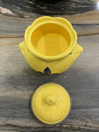 ✨For sale is an elegant 7-piece French porcelain Tea/Coffee Set in sunny yellow with classic blue Fleur-De-Lis accents✨ 📌 Crafted by Fournier, France, with a nod to American Rag Cie styling. 🔹...