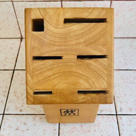 This J.A. Henckel Zwilling 6 Slot Empty Hardwood Knife Block is a classic knife holder made of wood with a beige color. This countertop accessory has six slots for organizing knives, with dimensions of 8 inches in depth, height, and 4.4 inches in width. The knife block is from the renowned brand ZWILLING J.A. HENCKELS, featuring a stylish and functional design for any kitchen or dining area. Made in Malaysia, this knife block is a practical addition to keep your kitchen knives neat and easily accessible.