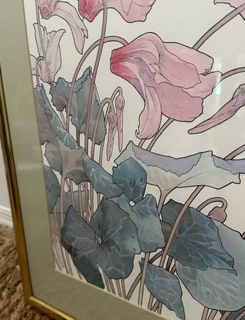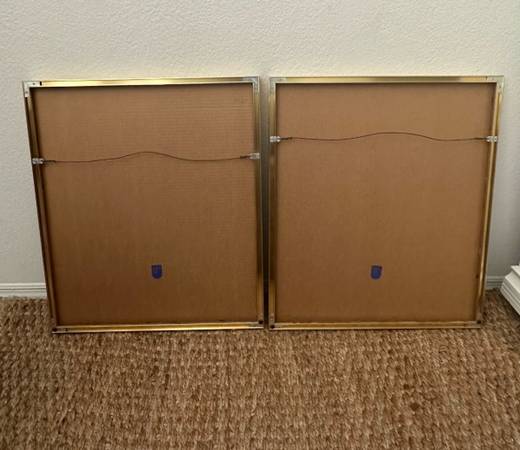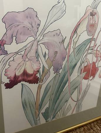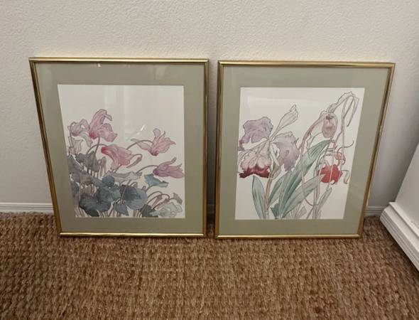 2 Vintage lithographs. Lilies have a water color theme. Artwork has been professionally framed. Brass / gold frame with glass. Frames are heavy, not flimsy. Approximately 21.5”x25 Postmodern Retro...