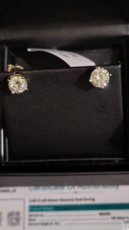 Pair of 14k, yellow gold ,round white diamond 2ct studs push back earings still in box with authenticity record, perfect for bigger lobbs. $800 firm delivery fee required.