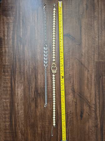 Two necklaces for sale separately or together: $18 - Pearl and gold handcuff necklace with standard " lobster claw" closure in back. Size reference in third photo. $15 - Steel and clear acrylic...