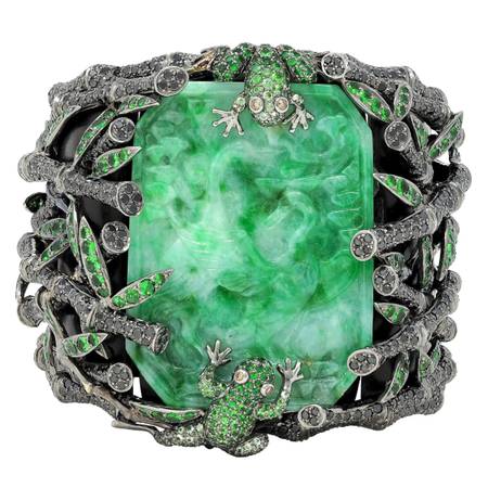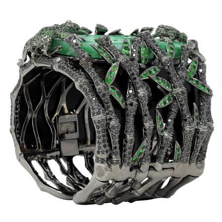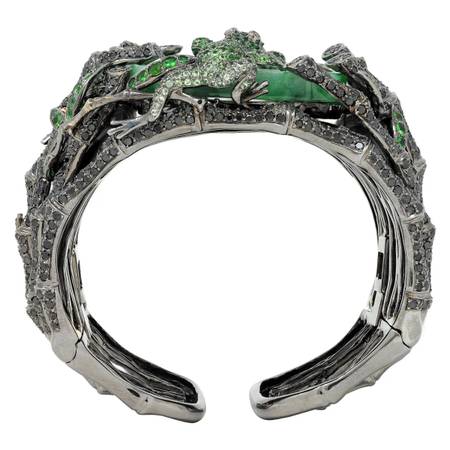 Foliate and frogs are pavé set with tsavorite garnets weighing approximately 10.33 carats total