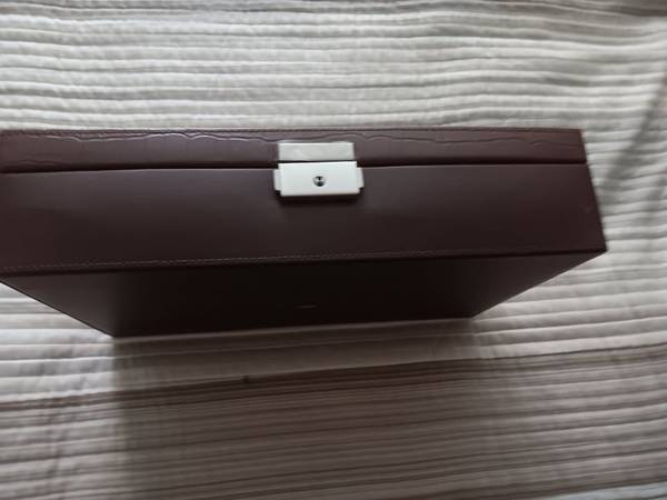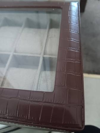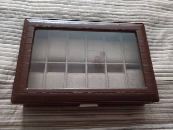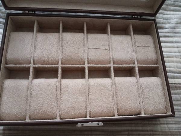 12 WATCH CASE FAUX BROWN LEATHER 12" X 8" X 3" LIKE NEW I FELL AND BECAME DISABLED AND HAD TO RETIRE HOMEBOUND SO I DON'T NEED THIS CASE. I HAD A 15 WATCH COLLECTION BUT DON'T GO ANYWHERE SO SOLD MOST OF MY COLLECTION ALREADY PD $30 SO NO LESS THAN $20