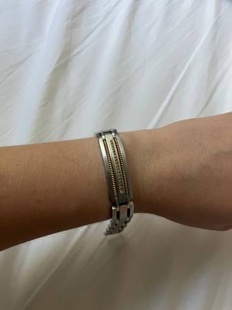 Mens stainless steel bracelet, with a centerpiece of 17 stones, either diamond or CZ (not sure). Has gold braid and 9 links, although more can likely be added. Clasp works. Bracelet is clean and wearable, with some minor scratches that could be buffed out. $500 OBO