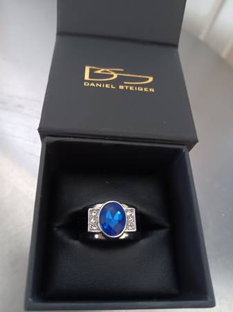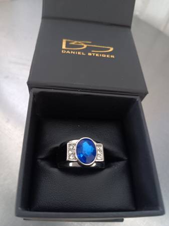 MEN'S SILVER PLATED RING WITH SYNTHETIC DEEP BLUE 2CT SAPPHIRE OVAL WITH BLACK ENAMEL SIDES NEW SIZES 8, 9 AND 10