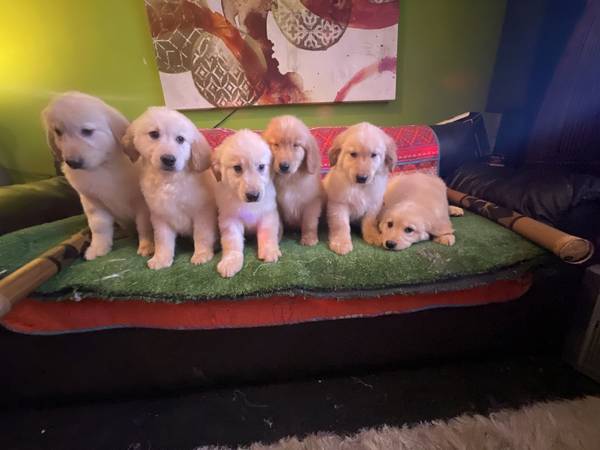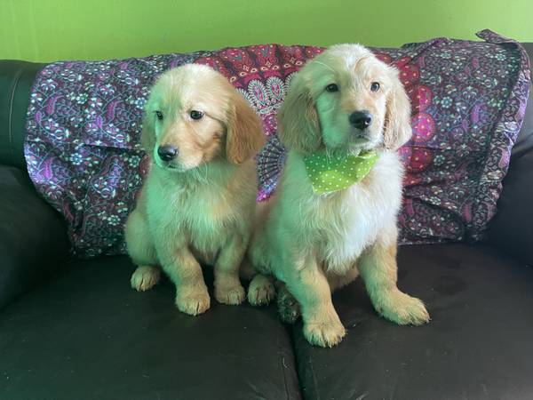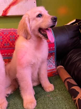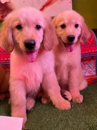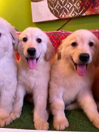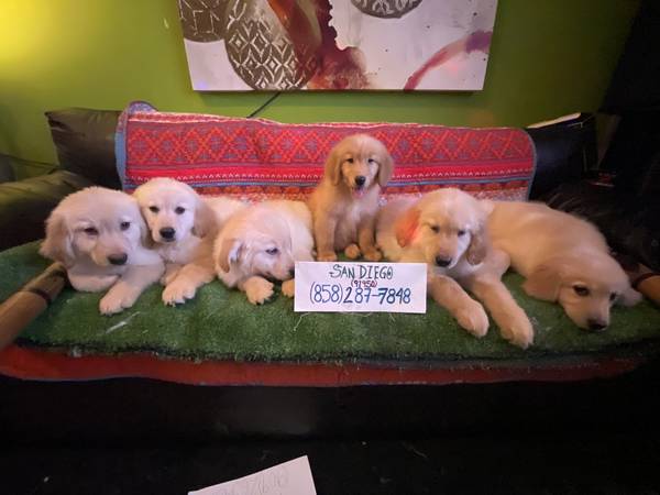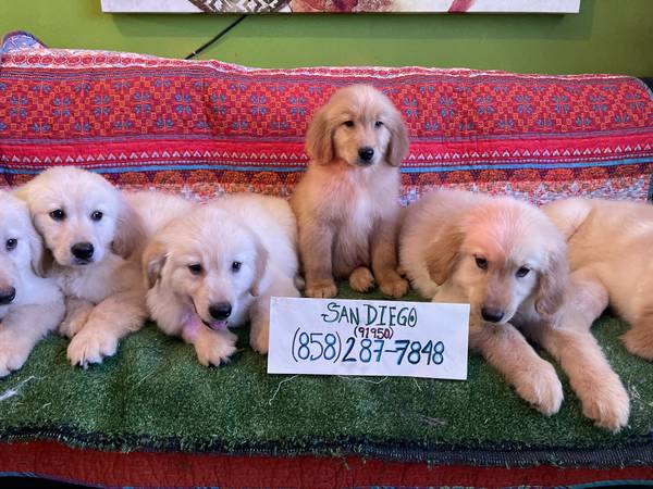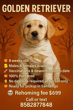 Golden available now. They are eight weeks old, males and females, healthy, playful, and very friendly. All puppies are purebred, vaccinated, and dewormed up to date. No deposits are required, we only deal in person. They are ready to be picked up in San Diego. Rehoming fee is $699. These puppies have been raised with care and make wonderful family companions.
